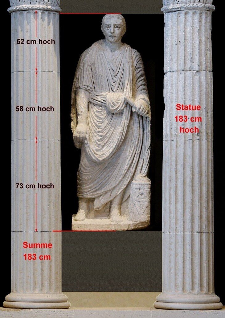 Es ließ sich finden, denn die Höhen der drei oberen Säulentrommeln und der dahinter liegenden, glei-chen Quaderhöhen der Aedikula ergaben in Summe ebenfalls ein Maß von 183 cm und entsprachen damit exakt der Höhe der Modestus-Statue.